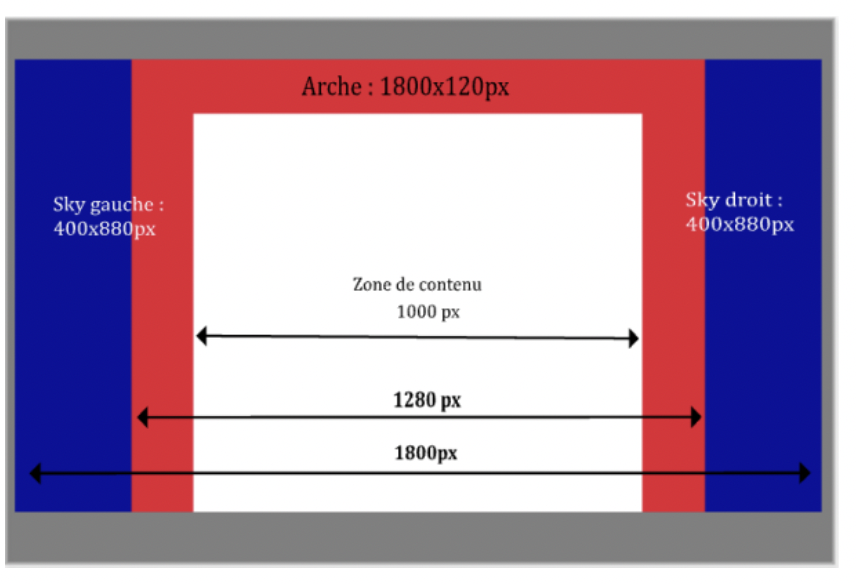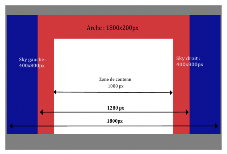 - L'habillage doit être optimisé pour une résolution de 1280px de largeur (zone rouge).